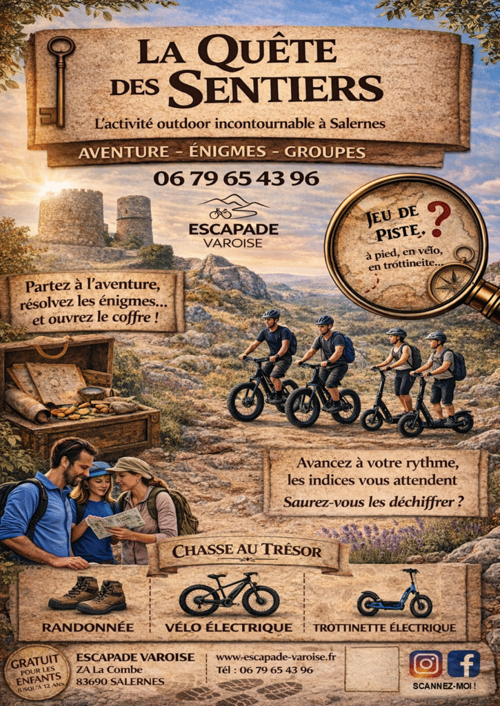 Besoin d’idées ? Combinez la liberté d’une balade à pied, en vélo électrique ou en trottinette électrique dans les paysages du Haut-Var avec une chasse aux énigmes en pleine nature, pensée pour tous les niveaux : familles, amateurs de défis ou groupes d’entreprise.